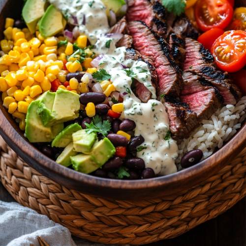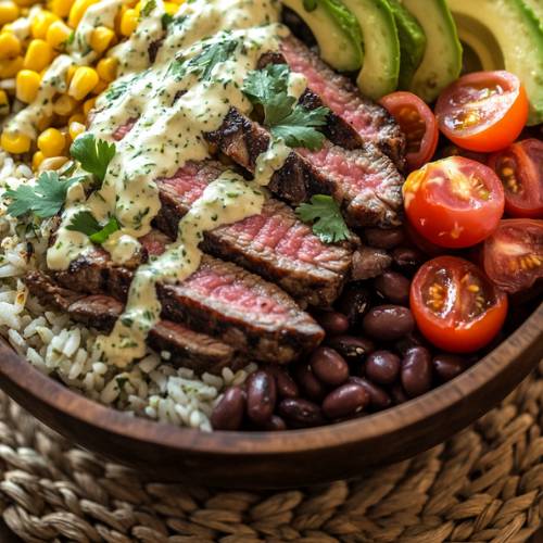 - Assemble the Bowl Now for the fun part! Layer a scoop of rice in a bowl, add slices of steak, spoon on that smoky corn salsa, and drizzle with cilantro lime sauce. You just made a masterpiece!