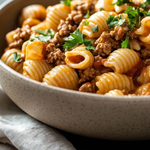 To begin, grab a large, deep skillet or pot and place it on medium-high heat. Add the ground beef to the pot and season it with 1 teaspoon of garlic powder, 1 teaspoon of onion powder, 1 teaspoon of paprika, 1/2 teaspoon of salt, and 1/2 teaspoon of black pepper. As the beef cooks, use a spatula to break it apart into small, bite-sized pieces. This helps the meat cook evenly and blend better with the pasta later on. Let it cook for about 5 minutes, or until the beef is nicely browned and no longer pink.