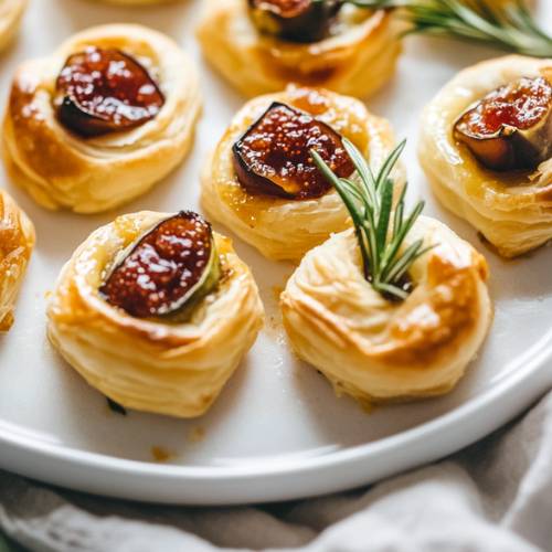 Layer a piece of prosciutto into each pastry cup. Then add a slice of creamy brie cheese. On top of that, drop in about ½ teaspoon of fig butter or jam. Finally, add a little rosemary leaf or two for a fresh flavor pop. - Bake