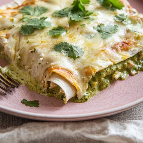 Bake uncovered at 350°F for 25 minutes. The cheese should be bubbly and golden! Top with fresh chopped cilantro, and your enchiladas are ready to serve!