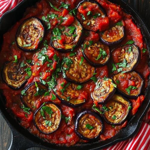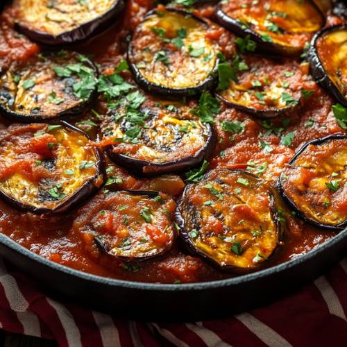 Drizzle a small amount of extra virgin olive oil over the assembled eggplant and tomatoes to bring out their natural flavors. Season with a pinch of salt and freshly ground black pepper to taste. Finally, sprinkle some chopped fresh parsley over the top for a touch of color and freshness.