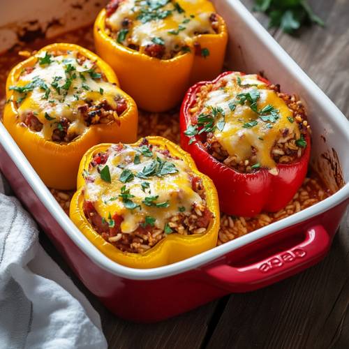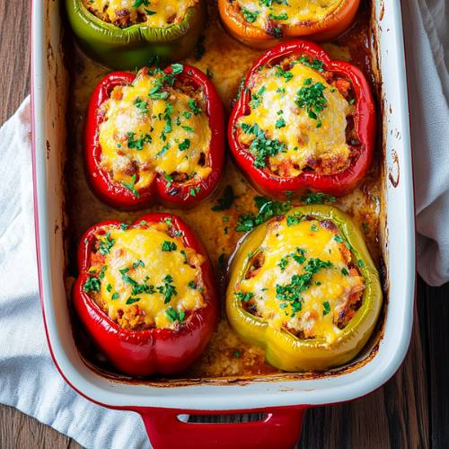 Now it’s time to prepare your bell peppers! Choose large, sweet ones red, yellow, or orange are best. Cut off the tops (keep those for later) and remove the seeds and membranes inside each pepper. You want a nice hollow space to hold the filling. Gently stuff each pepper with the chicken-rice mixture, pressing it down slightly but not packing it too tightly. It’s important to leave a little room at the top of each pepper since the rice will expand as it finishes cooking. Once filled, place the tops back onto the peppers like little hats.